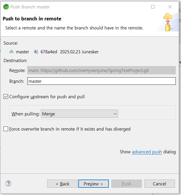 16. 6๋ฒ์์ ์ ๋ ฅํ ์ ๋ณด(๊นํ๋ธ URI, Authentication User, Password)๊ฐ ๋ฌธ์ ๊ฐ ์๋ค๋ฉด 'Push Branch master' ํญ๋ชฉ์ผ๋ก ๋์ด์ต๋๋ค. ํด๋น ํญ๋ชฉ ๊ทธ๋๋ก ์ ์งํ ์ํ๋ก Preview ๋ฒํผ์ ๋๋ฌ ๋ค์์ผ๋ก ์งํํฉ๋๋ค.