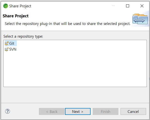 2. Share Project ํญ๋ชฉ์์ repository type์ 'Git'์ผ๋ก ์ ํ ํ, Next ๋ฒํผ์ ๋๋ฌ ๋ค์์ผ๋ก ์งํํฉ๋๋ค.