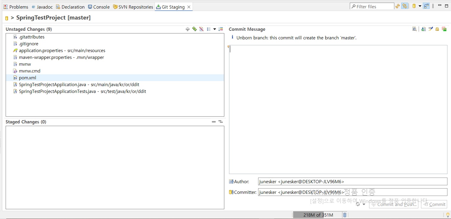 5. 'Unstaged Changes' ํญ๋ชฉ์ ํ์ผ๋ค์ 'Staged Changes' ํญ๋ชฉ์ผ๋ก ์ด๋ ํ, Commit and Push ๋ฒํผ์ ์ ํํฉ๋๋ค.