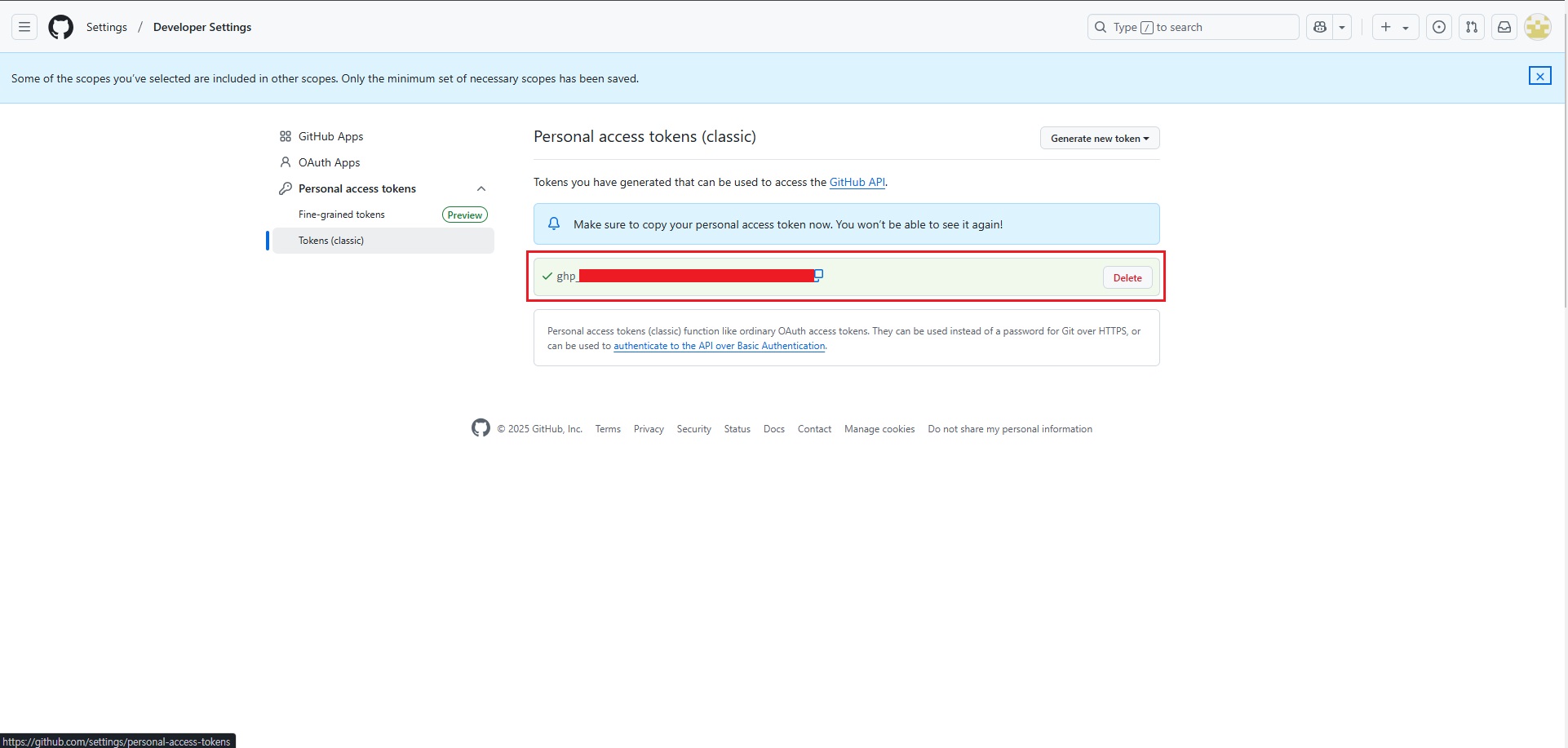 15. ํ ํฐ์ด ๋ฐํ๋์์ต๋๋ค. ๋ น์์ผ๋ก ํ์๋ 'ghp_'๋ก ์์ํ๋ ํ ํฐ ํค ๊ฐ์ ๋ฐ๋ก ์ ์ฅํด๋ก๋๋ค.