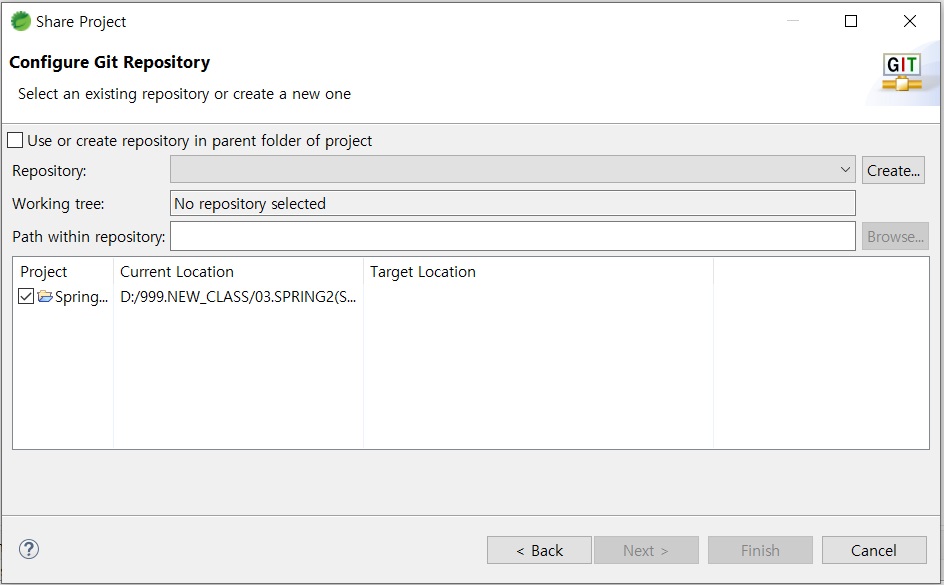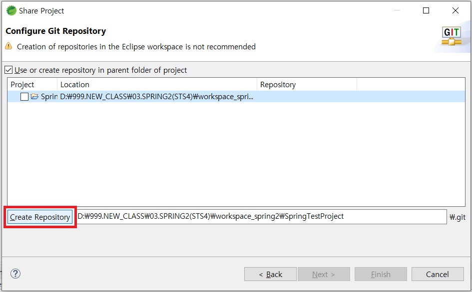 3. 'Configure Git Repository' ํญ๋ชฉ์ 'Use or create repository in parent folder of project' ์ฒดํฌ๋ฐ์ค๋ฅผ ์ฒดํฌํ๋ค. ๊ณต์ ํ๊ณ ์ ํ๋ ํ๋ก์ ํธ๋ฅผ ์ ํ ํ, 'Create Repository' ๋ฒํผ์ ์ ํํ๊ณ Finish ๋ฒํผ์ ๋๋ฌ ๋ค์์ผ๋ก ์งํํฉ๋๋ค.
