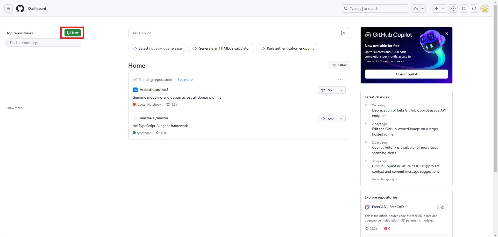 7. ๊นํ๋ธ ๊ณต์ ํํ์ด์ง์ ๋ก๊ทธ์ธ ํ, 'New' ๋ฒํผ์ ์ ํํฉ๋๋ค.