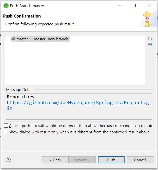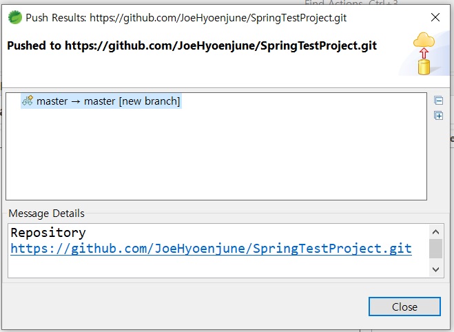 18. Push ๊ฒฐ๊ณผ๋ฅผ ํ์ธ ํ, Close ๋ฒํผ์ ๋๋ฌ ๋ง๋ฌด๋ฆฌํฉ๋๋ค.