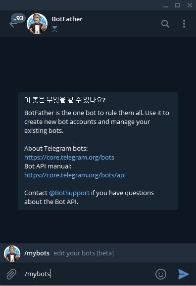 BotFather ๋ด์ ์คํ ์ํจ ํ, ๋ฉ์ธ์ง ์ ๋ ฅ์ฐฝ์ "/mybots"์ด๋ผ๊ณ ์ ๋ ฅํ๊ฑฐ๋ ์ด๋ชจํฐ์ฝ ์์ด์ฝ ์ผ์ชฝ์ ๋ค๋ชจ์นธ์ "/"๊ฐ ์๋ ์์ด์ฝ์ด ์๋๋ฐ ๊ทธ ์์ด์ฝ์ ๋๋ฌ์ "/mybots"๋ฅผ ์ฐพ์ ๋๋ฌ์ค๋ ๋๋ค.