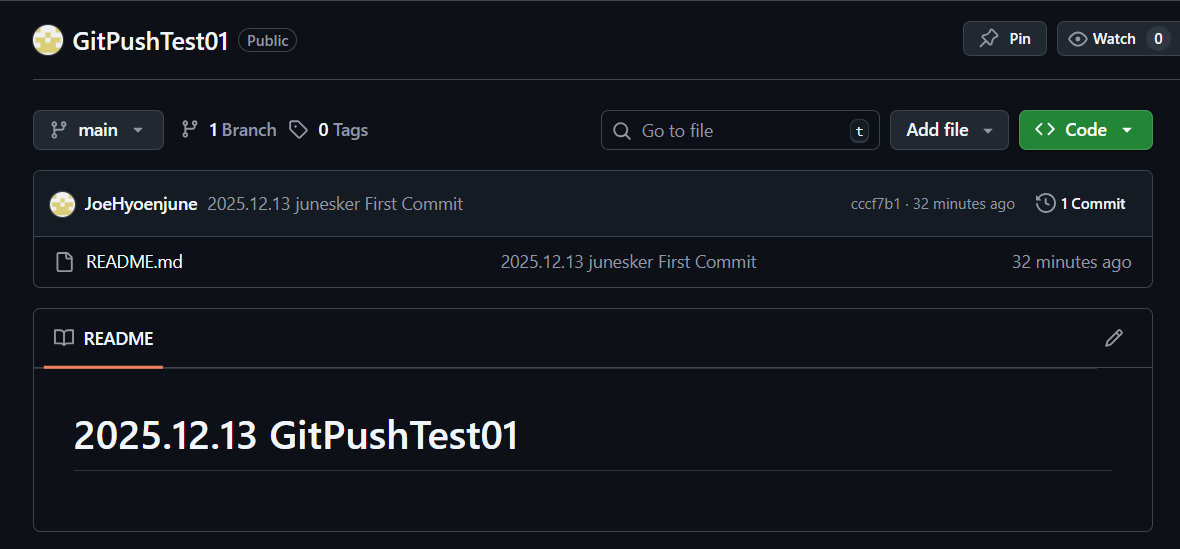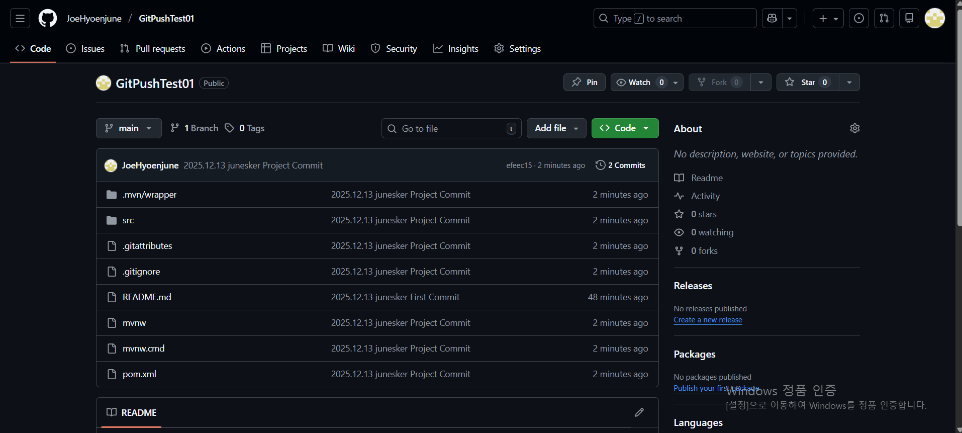 15. Git Repository๋ฅผ ํ์ธํด๋ณด๋ฉด, README ํ์ผ์ด ์ ์์ ์ผ๋ก ์๊ฒฉ์ ์ฅ์๋ก Push ๋๊ฑธ ํ์ธํ ์ ์์ต๋๋ค.
