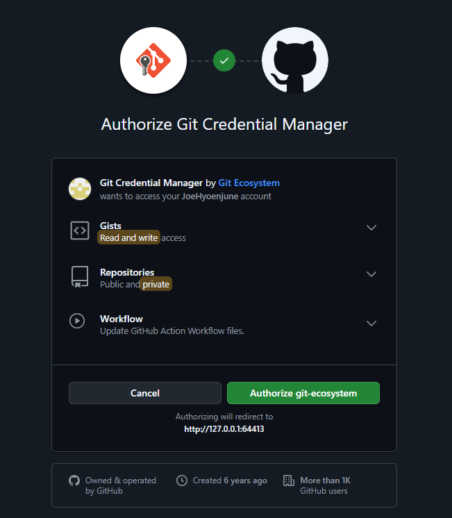 Git์ ๋ก์ปฌ ์ปค๋ฐ ๋ด์ฉ์ ์๊ฒฉ ์ ์ฅ์๋ก ์ ์กํ๊ธฐ ์ ์, ์ฌ์ฉ์๊ฐ ํด๋น ์ ์ฅ์์ ์ฝ๋๋ฅผ ์ธ ๊ถํ์ด ์๋ ์ฌ๋์ธ์ง๋ฅผ ํ์ธํ๊ธฐ ์ํด ๋ก๊ทธ์ธ์ ์งํํ ์ ์๋๋ก ๋ก๊ทธ์ธ window ์ฐฝ์ ์ ๊ณตํฉ๋๋ค. ๊ถํ์ ํ์ธํ ์ ์๋๋ก ๋ก๊ทธ์ธ์ ์งํํฉ๋๋ค.