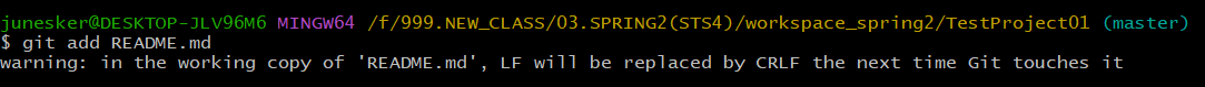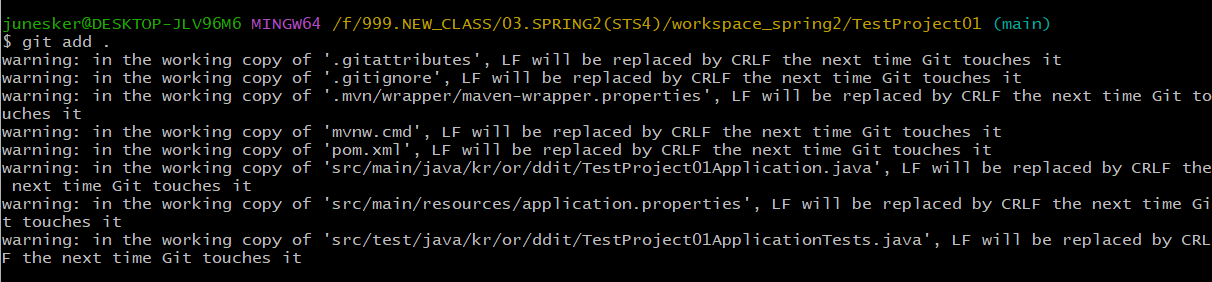 'git add .' ๋ช ๋ น์ด๋ ํ์ฌ ํด๋์ ์ปค๋ฐ ํด์ผํ ํ์ผ๋ค์ ์คํ ์ด์ง ์์ญ์ผ๋ก ์ฎ๊ธฐ๋ ๋ช ๋ น์ด์ ๋๋ค. ๊ทธ๋์ผ ์คํ ์ด์ง์ผ๋ก ์ฎ๊ฒจ์ง ํ์ผ๋ค์ ์ปค๋ฐํ ์ ์์ต๋๋ค. ๋ช ๋ น์ด ์ถ๋ ฅ ํ ๋ํ๋๋ warning ๋ฉ์์ง๋ ๋ฌด์ ๊ฐ๋ฅํ ๋ฉ์ธ์ง๋ก, ์ฌ์ฉ OS์ ๋ฐ๋ผ์ ์ค๋ฐ๊ฟ ์ฒ๋ฆฌ๊ฐ ๋ค๋ฅธ๋ฐ ํ์ฌ ํ์ผ๋ค์ LF ์คํ์ผ์ ์ค๋ฐ๊ฟ์ ๊ฐ์ง๊ณ ์์ง๋ง Windows ํ๊ฒฝ์์ ์ค ๋ฐ๊ฟ ์ถฉ๋์ ๋ง๊ธฐ ์ํด Git์ด ํ์ผ๋ค ๋ค๋ฃฐ ๋ CRLF๋ก ์๋ ๋ณํ๋๋ฉด์ ์ถ๋ ฅํ๋ ๋ฉ์์ง์ ๋๋ค.