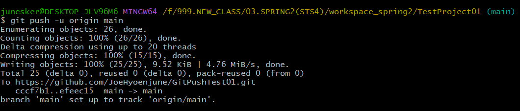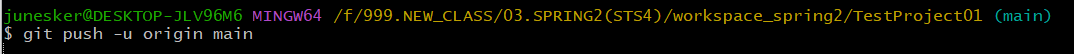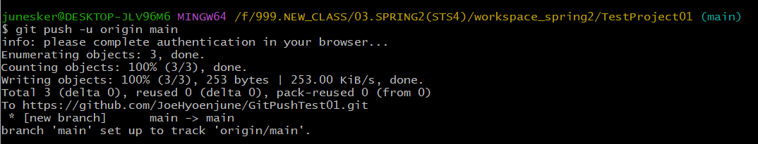 4. ' git push -u origin main ' ๋ช ๋ น์ด๋ฅผ ์ ๋ ฅํด์ฃผ์ธ์.