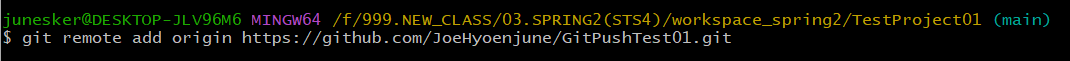 9. ' git remote add origin https://githup.com/JoeHyoenjune/GitPushTest01.git ' ๋ช ๋ น์ด๋ฅผ ์ ๋ ฅํด์ฃผ์ธ์.