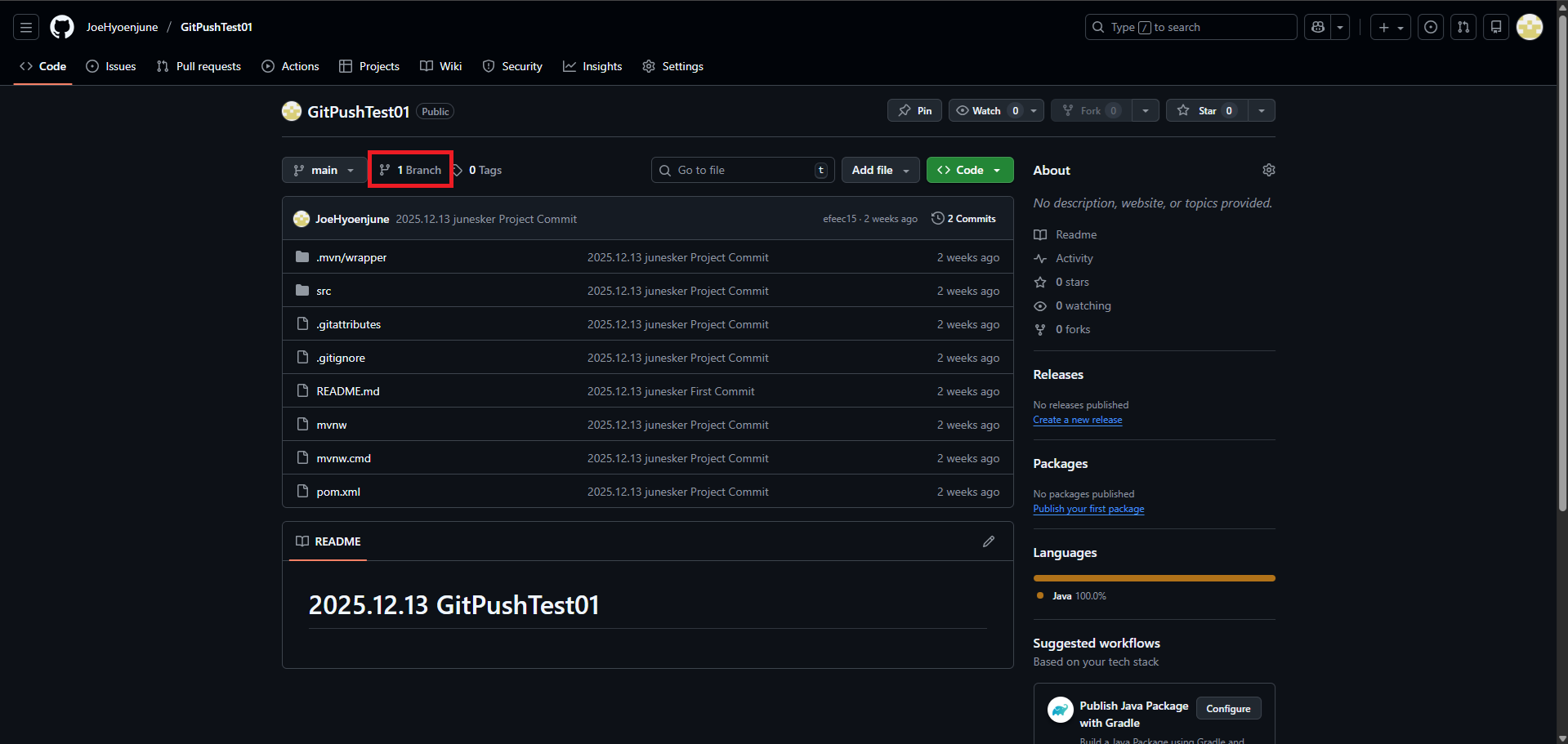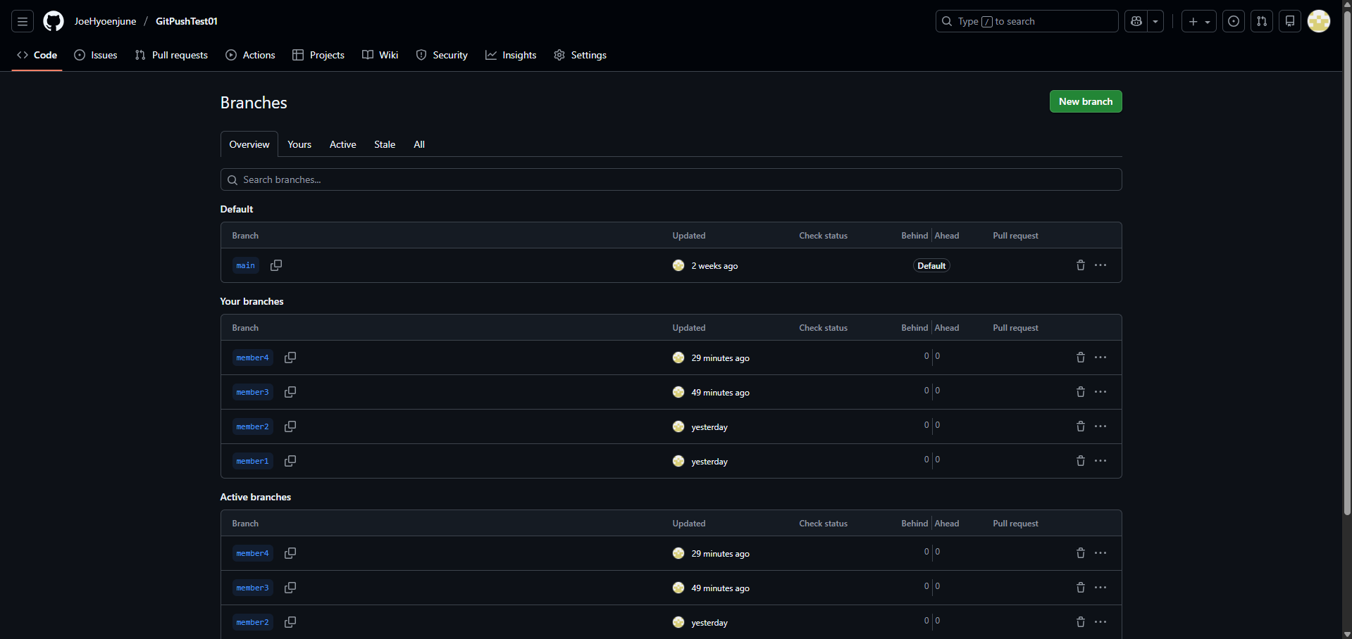 12. GitHub์ ํด๋น Repository์์ Branch๋ฅผ ํ์ธํด๋ณด๋ฉด ์ถ๊ฐํ member3 ๋ธ๋์น๊ฐ ์์ฑ๋๊ฑธ ํ์ธํ ์ ์์ต๋๋ค.