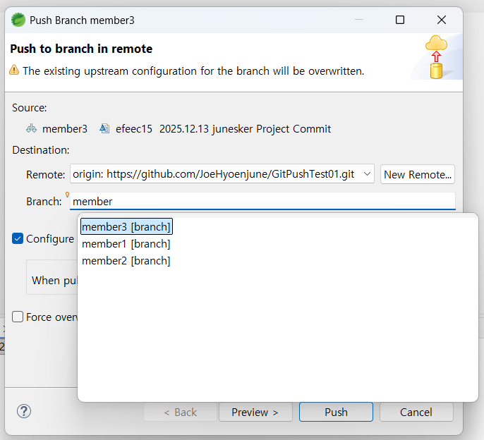 9. Remote, Branch ์ ๋ณด๋ฅผ ํ์ธ ํ, Branch ํญ๋ชฉ์์ ์๊น ๋ง๋ค์๋ member3 ๋ธ๋์น๋ฅผ ์ ๋ ฅํ๊ฑฐ๋ ์๋ ์์ฑ๋ ํญ๋ชฉ๋ค ์ค ํ๋๋ฅผ ์ ํํฉ๋๋ค. ์ ํ ํ, Push ๋ฒํผ์ ํด๋ฆญํฉ๋๋ค.