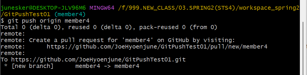 3. 'git push origin member4' ๋ช ๋ น์ด๋ก ์๋กญ๊ฒ ๋ง๋ member4 ๋ธ๋์น๋ฅผ main ๋ธ๋์น ํ์๋ก pushํฉ๋๋ค.
