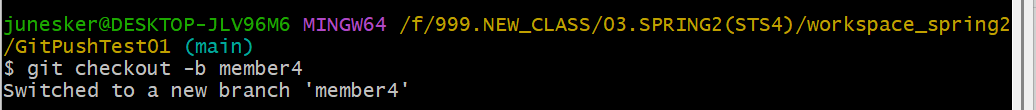 2. 'git checkout -b member4' ๋ช ๋ น์ด๋ก ์๋ก์ด ๋ธ๋์น member4๋ฅผ ๋ง๋ค๊ณ ์ง์ ํฉ๋๋ค.