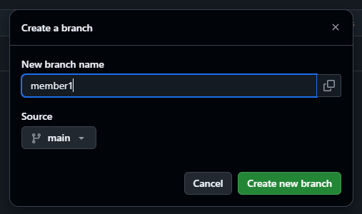5. 1-4๋ฒ ๋ฐฉ๋ฒ ์ธ์ ๋๋ ํด๋น Repository์์ 'main' ๋ธ๋์น ์ ๋ ํธ ํญ๋ชฉ์ ์ด์ด์ ๋ํ๋๋ ๊ฒ์๋์ ์ถ๊ฐํ ๋ธ๋์น๋ช ์ ์ ๋ ฅ ํ, ์๋๋ก ์ถ๋ ฅ๋๋ 'Create branch member2 from main' ๋ฌธ๊ตฌ๋ฅผ ํด๋ฆญํ๋ฉด main ํ์ ๋ธ๋์น๋ก ์ ๋ ฅํ member2 ๋ธ๋์น๊ฐ ๋ง๋ค์ด์ง๋๋ค.
