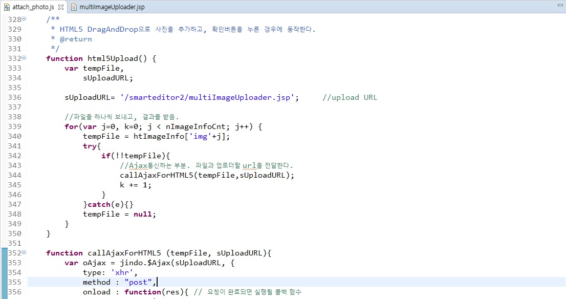 sample/photo_uploader/attach_photo.jsํ์ผ์ ์ฐ๋ค. attach_photo.js์์ ์๋ callFileUploader()์ html5Upload() ํจ์๋ฅผ ์์ ํด์ผํ๋ค. callFileUploader()๋ ์ฑ๊ธ ์ด๋ฏธ์ง ์ ๋ก๋ ํ์ ์ฐฝ์ผ๋ก ์ด๋ฏธ์ง๋ฅผ ์ ๋ก๋ํ ๋ ์ฌ์ฉ๋๊ณ , html5Upload()๋ ๋ฉํฐ ์ด๋ฏธ์ง ์ ๋ก๋ ํ์ ์ฐฝ์ผ๋ก ์ด๋ฏธ์ง๋ฅผ ์ ๋ก๋ํ ๋ ์ฌ์ฉ๋๋ค.