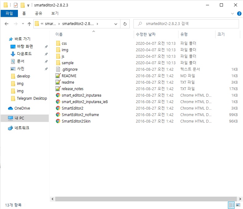 ๋ค์ด๋ฐ์ ๋ค์ด๋ฒ ์ค๋งํธ์๋ํฐ2 ๋ฒ์ 2.8.2.3 ํ์ผ์ ์์ถํด์ ํ๋ฉด ์์๊ฐ์ ํ์ผ๊ตฌ์กฐ๊ฐ ๋์จ๋ค. ์ด๋ฏธ์ง ์ ๋ก๋์ ํ์ํ js์ html์ sampleํด๋์ ์กด์ฌํ๋ค.