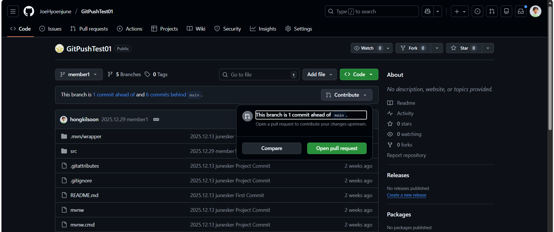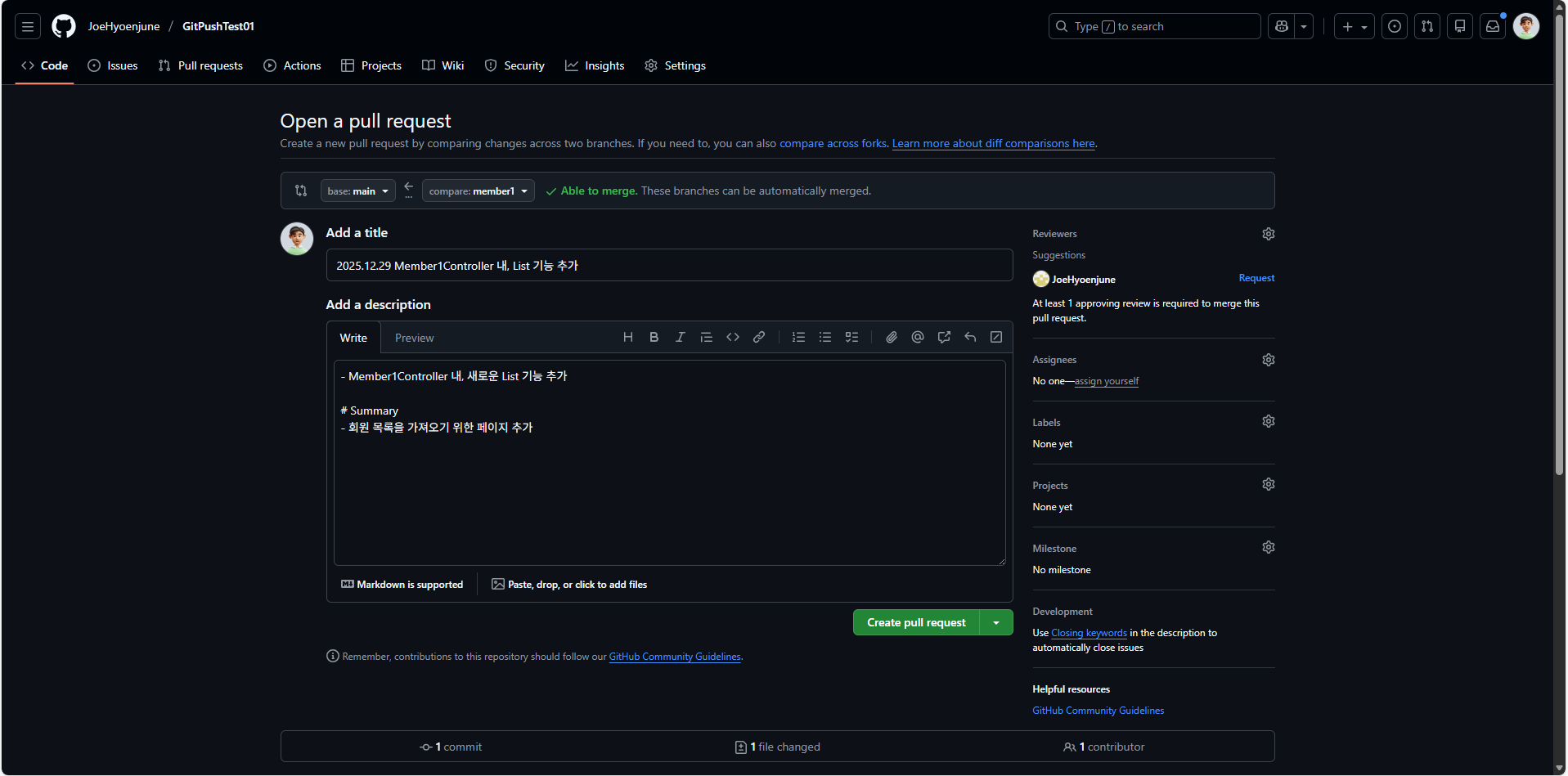 ํ์์ด ๋ณธ์ธ ๋ธ๋์น(member1)์ ์์ ์ ๋ง์น ์์ค๋ฅผ Commit & Push๋ฅผ ์งํํฉ๋๋ค. ์งํ ํ, GitHub ํํ์ด์ง์ Pull Request ์์ญ์์ ํ์ฅ์๊ฒ '์์ค ํ์ธ ํ Merge ๋ถํ๋๋ฆฝ๋๋ค. ์น์ธํด์ฃผ์ธ์!'๋ฅผ ์งํํฉ๋๋ค.