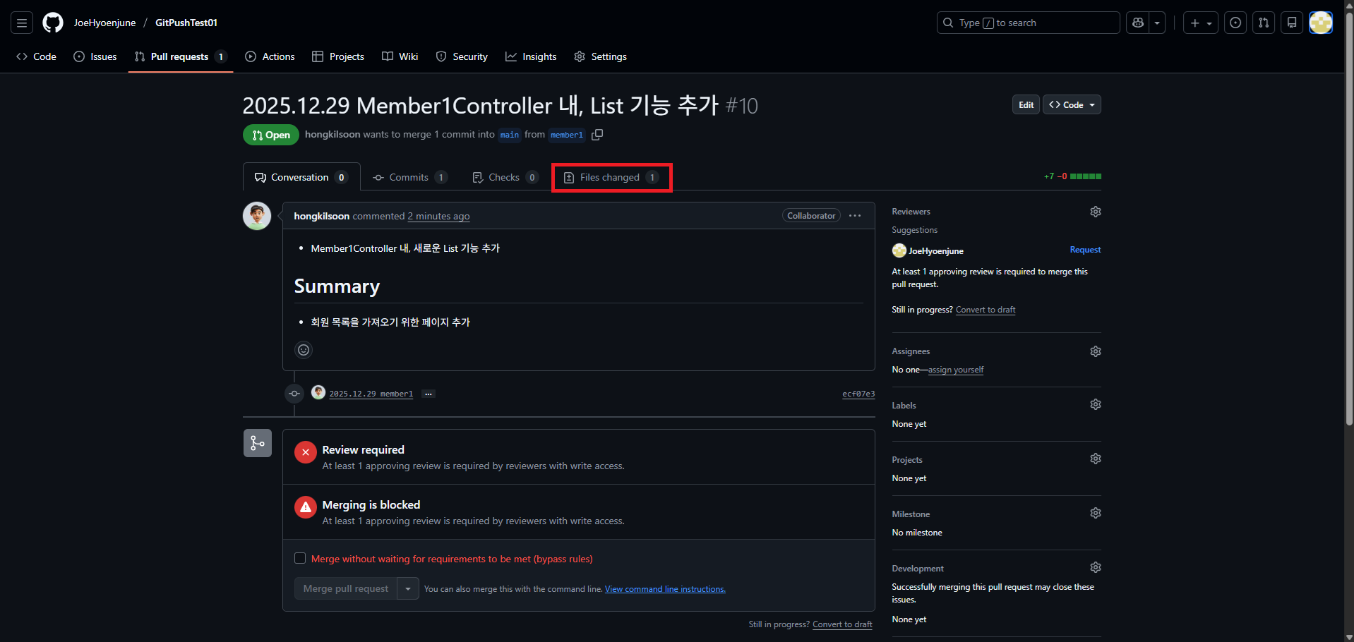 - PR ์ํ๊ฐ 'Changes requested'๋ผ๋ ๊ฐ๋ ฅํ ๋นจ๊ฐ ๊ฒฝ๊ณ ๋ก ๋ฐ๋๊ณ ํ์์ด ์ฝ๋๋ฅผ ์์ ํด์ ๋ค์ ์ฌ๋ฆฌ๊ธฐ ์ ๊น์ง๋ ์ ๋๋ก Merge ํ ์ ์๋๋ก ์ฐจ๋จ๋ฉ๋๋ค.