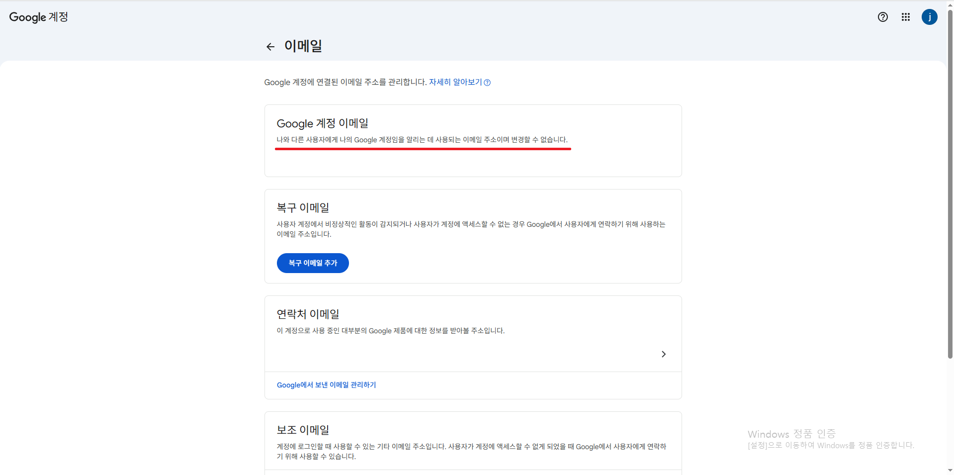 2. Google ๊ณ์ ์ด๋ฉ์ผ ํญ๋ชฉ์ ์์ ๋ฒํผ์ ํ์ธํด ์ฃผ์ธ์.