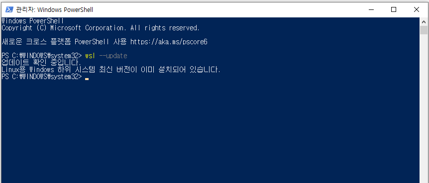 1. 'Windows PowerShell'์ ๊ด๋ฆฌ์ ๊ถํ์ผ๋ก ์คํํฉ๋๋ค. ์คํ ํ, 'wsl --update' ๋ช ๋ น์ด๋ฅผ ์ ๋ ฅํ์ฌ wsl ์ ๋ฐ์ดํธ๋ฅผ ์งํํฉ๋๋ค.
