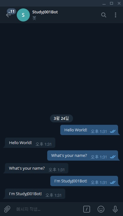 5. StudyJ001Bot ์คํ ํ, ๋ฉ์์ง ์ ์ก ํ์ธ