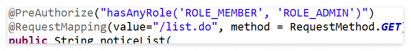 @PreAuthorize ์ด๋ ธํ ์ด์ ์ ํตํด ํ๊ฒ์ผ๋ก ์ ๊ทผ ์ , ์ธ์ฆ์ด ์งํ๋์ด์ผํ๊ณ hasAnyRole์ ์ค์ ๋์ด ์๋ 'MEMBER'์ 'ADMIN' ๊ถํ๋ง ์ ๊ทผ ๊ฐ๋ฅํ๋๋ก ํ๊ฒ์ด ์ค์ ๋์ด ์๋ค. ๊ทธ๋ ๊ธฐ ๋๋ฌธ์ 'MEMBER'์ 'ADMIN' ๊ถํ์ ๊ฐ๊ณ ์๋ ์ฌ์ฉ์ ๊ณ์ ์ผ๋ก ์ ๊ทผํ๋ค๋ฉด ๋ฌธ์ ๊ฐ ์๊ฒ ๋ค.