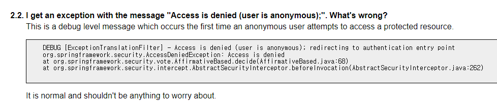 ๊ถํ์ด ์ค์ ๋์ด ์๋ ํ๊ฒ์ผ๋ก ์ ๊ทผ ์, ๋ก๊ทธ์ธ ์ธ์ฆ ํ์ด์ง๊ฐ ๋ํ๋๋๋ฐ ์ด๋, ์๋ฌ ๋ฉ์ธ์ง๋ก 'Access is denied (user is anonymous)'์ ๊ฐ์ ์๋ฌ๊ฐ ๋ฐ์ํ ์ ์์ต๋๋ค. ํด๋น ์๋ฌ ๋ฉ์ธ์ง๋ ์คํ๋ง ํ๋ ์์ํฌ ๊ณต์ ๋ฌธ์์์ ์ค๋ช ํ๊ธธ '์ด๋ ์ต๋ช ์ฌ์ฉ์๊ฐ ๋ณดํธ๋ ๋ฆฌ์์ค์ ์ฒ์์ผ๋ก ์ก์ธ์คํ๋ ค๊ณ ํ ๋ ๋ฐ์ํ๋ ๋๋ฒ๊ทธ ์์ค ๋ฉ์ธ์ง์ ๋๋ค.' ๋ผ๊ณ ๊ฐ์ด๋ํ๊ณ ์์ผ๋ฉฐ, ์ด๋ ์ ์์ ์ธ ํ์์ด๋ฉฐ ๊ฑฑ์ ํ ํ์๊ฐ ์๋ค๋ผ๊ณ ๊น์ง ์ค๋ช ํ๊ณ ์์ต๋๋ค.